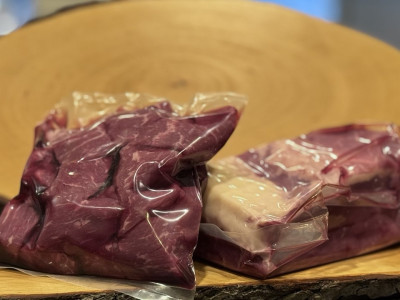Das Foto zeigt Rindergulasch und Rinderbrust im Vakuumbeutel. Das Gulasch besteht aus mageren Stücken mit feiner Marmorierung. Die Brust eignet sich gut zum Kochen. Beide Stücke liefern kräftigen Geschmack. Ideal für deftige Gerichte. Die Portionen sind küchenfertig verpackt.